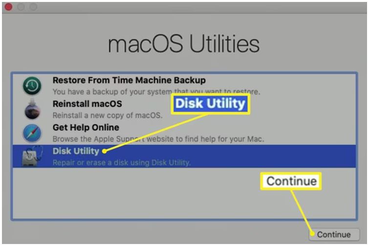 - Now, select Disk Utility from the macOS Utilities window.